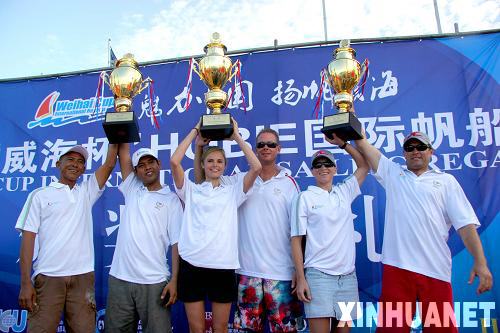 9月7日,获得本次HOBIE国际帆船邀请赛冠、亚、季军的队员在一起合影。当日,为期3天的2009“威海杯”中国首届HOBIE国际帆船邀请赛在山东威海国际帆船基地——威海国际海水浴场正式收帆。澳大利亚二队和一队分获冠亚军,泰国队获得第三名。