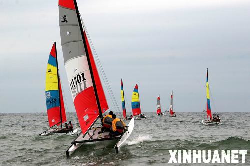 9月7日,参加“威海杯”中国首届HOBIE国际帆船邀请赛的选手在大海中激烈角逐。当日,为期3天的2009“威海杯”中国首届HOBIE国际帆船邀请赛在山东威海国际帆船基地——威海国际海水浴场正式收帆。澳大利亚二队和一队分获冠亚军,泰国队获得第三名。