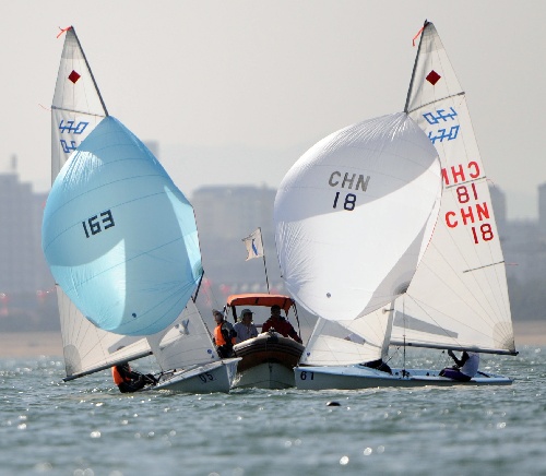 日照(山东),2009年10月17日 (全运会)(1)帆船帆板——帆船470级赛况 10月17日,解放军队选手王茹/高阳(左)和浙江队选手邱彬彬/何新燕在女子470级比赛中。当日,第十一届全运会帆船470级比赛在山东省日照市拉开战幕。 |