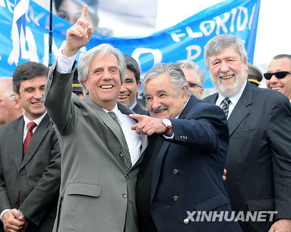 10月19日,乌拉圭总统巴斯克斯(前左)在首都蒙得维的亚欢迎乌拉圭海军“米兰达船长”号帆船教练舰归来。新华社发(尼古拉斯·色拉亚摄)