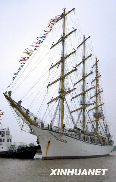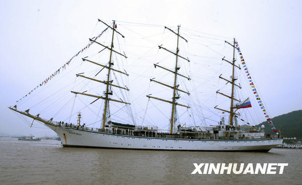 当日,来自俄罗斯的大型仿古帆船“纳齐达”号在舟山边防检查站监护中队官兵的引航下,缓缓驶进沈家门渔港。这艘船全长108.6米,宽14米,船上有约160名俄罗斯籍船员。“纳齐达”号受邀参加沈家门渔港建港600周年庆典活动。新华社发(胡社友 摄)
