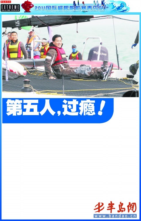 4月14日,2011国际极限帆船系列赛青岛站“双星杯”比赛展开了第二个比赛日的争夺。相比于竞争激烈的比赛本身,各支船队新加入的“第五人”无疑成为当日的最大看点。包括市长夏耕 、副市长王修林在内的60多名“第五人”参加了下午的比赛。最终,首日比赛冠军新西兰酋长船队继续高歌猛进,以总成绩98分保住了头名的位置,红牛船队以96分追至次席。