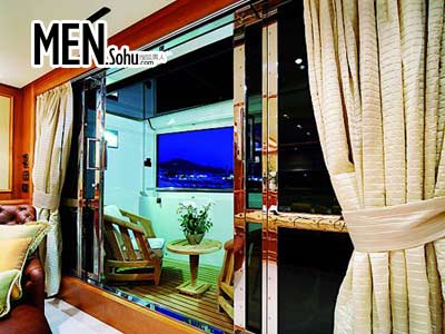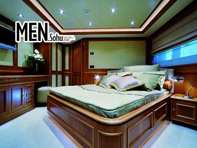 船东区占了主甲板的整个前部,可由右舷进出。包括一间私人书房、带中央双人床的套房、梳妆台和衣柜。最迷人的是右舷的海上露台,扶椅和茶几构成奢华的私人休闲空间,令人心驰神往。同样豪华的浴室占据整个船宽,配有两套马桶、洗手盆和淋浴。