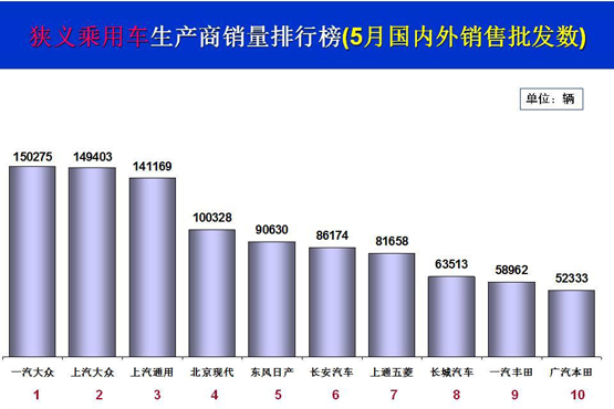 在5月份狭义乘用车批发销量前十名车企中,一汽大众以872辆的微弱优势领先上汽大众,连续两个月夺得冠军。 以下是5月份狭义乘用车批发销量前十排名。 第1名:一汽大众 5月份狭义乘用车批发销量:150,275辆。 第2名:上汽大众 5月份狭义乘用车批发销量:149,403辆。 第3名:上汽通用 5月份狭义乘用车批发销量:141,169辆。 第4名:北京现代 5月份狭义乘用车批发销量:100,328辆。 第5名:东风日产 5月份狭义乘用车批发销量:90,630辆。 第6名:长安汽车 5月份狭义乘用车批发销量:86,174辆。 第7名:上汽通用五菱 5月份狭义乘用车批发销量:81,658辆。 第8名:长城汽车 5月份狭义乘用车批发销量:63,513辆。 第9名:一汽丰田 5月份狭义乘用车批发销量:58,962辆。 第10名:广汽本田 5月份狭义乘用车批发销量:52,333辆。 |