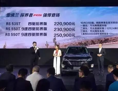 雪佛兰探界者RS在车展上宣布上市,共三款车型,售价22.09万-25.09万元。探界者RS在探界者基础上升级打造,延用现款车型外观设计,前进气格栅采用熏黑处理,并加入了“RS”标识,更加运动。新车拥有专属外观套件设计,凸显出更强悍的运动气质。被主办方请来助阵的港台明星邓紫棋,也笑称探界者RS像自己一样高冷强悍。