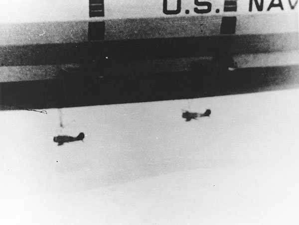 “梅肯”号正在回收F9C-2“雀鹰”侦察机,这需要飞行员的高超技术。