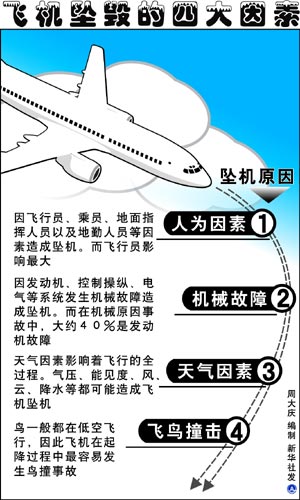 飞机坠毁的四大因素 新华社发 科普:飞机坠毁原因知多少 新华网北京6月2日电(记者刘军)法国航空公司一架载有228人的客机1日在大西洋上空失踪。法航方面称,飞机很可能已坠海。目前有关飞机坠毁的原因众说纷纭,排除恐怖袭击的原因,一般来讲,造成飞机坠毁的主要原因包括人为因素、机械故障、恶劣天气、飞鸟撞击等。 这里说的人为因素是指飞行员、乘员、地面指挥人员以及地勤人员等。而最关键的还是控制飞行方向的飞行员。造成飞行员失误的原因无外乎生理和心理两方面。从生理上来讲,高空缺氧、高空减压、飞行加速度等都会使飞行员头昏、突然丧失意识,时间可达十几秒甚至二十几秒,这足以使高速飞行的飞机坠毁。而高空还会使人的心理产生错觉。另外,疲劳飞行等也会造成飞行隐患。不过飞行员都训练有素,体质好于常人,因飞行员人为因素发生的坠机还是鲜有发生。 机械故障:飞机的发动机、控制操纵、电气等十几个系统,都有发生机械故障的可能。在机械原因事故中,大约40%是发动机故障,发动机是飞机的“心脏”,一旦出现大的故障,飞机就会因失去动力造成机毁人亡的悲剧。这次法航客机失踪后,法航首席执行官皮埃尔-亨利·古尔容说,飞机在失事前出现了多个技术故障,这可能是飞机失事的真正原因。 天气因素:天气因素影响着飞行的全过程,气压、能见度、风、云、降水等与飞行安全息息相关。今年2月12日,美国大陆航空公司一架通勤飞机在纽约州布法罗市附近坠毁,造成50人死亡、若干人受伤。有美国媒体报道说,本次坠机事件的原因是布法罗地区雨夹雪的天气造成的。 飞鸟撞击:鸟一般都在低空飞行,因此飞机在起降过程中最容易发生鸟撞事故。这也就是为什么绝大多数鸟撞事故都发生在机场和机场附近空域1500米高度以下,全世界民用和军用机场因此都装有驱鸟设备。目前,鸟撞飞机已成为威胁航空安全的重要因素之一。虽然鸟撞飞机占飞机遭撞事件中的大部分,但像鹿、草原狼、蝙蝠和短吻鳄等动物在飞机起降过程中撞飞机事件也发生过多次。 今年1月15日,全美航空公司一架客机在起飞后不久坠入纽约哈德孙河中。纽约市政府紧急出动船只救援,机上150多人全部获救。这起坠机事件疑由飞鸟撞机所致。 |