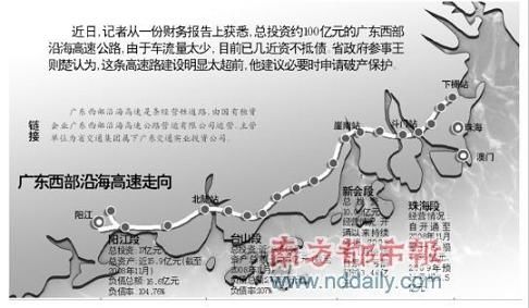近日,记者从一份财务报告上获悉,总投资约100亿元的广东西部沿海高速公路,由于车流量太少,目前已几近资不抵债。省政府参事王则楚认为,这条高速路建设明显太超前,他建议必要时申请破产保护。