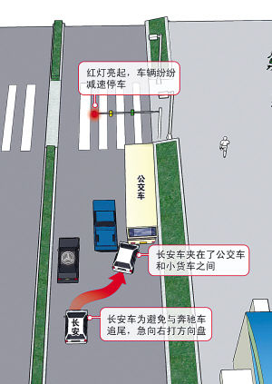 ![]() 长安货车夹在公交车与另一辆货车之间 ![]()