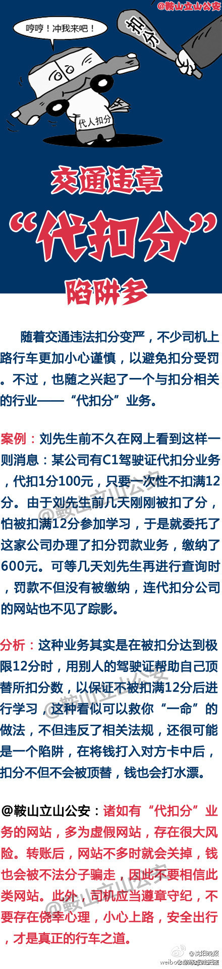 随着交通违法扣分变严,司机上路行车更加小心谨慎,以避免扣分受罚。随之也兴起了一个与扣分相关的行业—“代扣分”业务。诸如有此类网站,多为虚假网站,存在很大风险。转账后,网站不多时就会关掉,钱也会被不法分子骗走,因此不要相信此类网站。 ![]() |