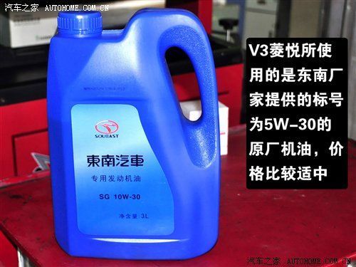 从表上看,我们可以看到,V3菱悦的首保只需要更换机油和机滤,而且是免费的,其后每隔5000km做一次常规保养,8000km时除更换机油机滤外,还需要更换空气滤芯、汽油滤芯以及变速箱油,但是材料费用总计却并不高,只需要401元。而整车最高的保养费用出现在将近50000km的时候,需要更换的项目也最多,不过对于一般的家庭来说,那已经是买车两年后的事情了。 表格中显示的为东南三菱V3菱悦的每5000公里为单位的保养周期及保养项目,每次保养时技术人员都会对车内的所有部件进行检查,上图中标注实心圆圈的表示一般需要更换的部件名称,画横线部分表示正常驾驶一般不需要更换,但是如果检测人员检查后发现需要更换,会根据实际车况与车主进行交涉后进行更换。 V3菱悦所用的机油是东南汽车厂家提供的标号10W-30的机油,该机油价格比较适中,当然消费者也可以选择价位更高一些的高品质机油,或者自备机油到店进行保养。