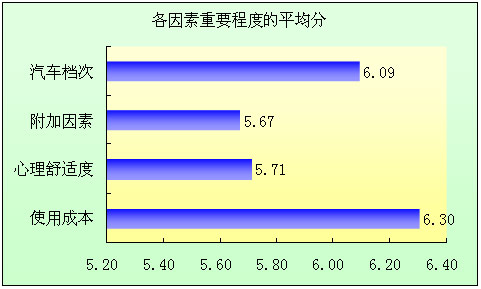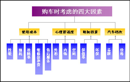 对购车考虑因素进行分析,分别是:使用成本、心理舒适度、附加因素和汽车档次。它们共同组成消费者购车时考虑的四大因素。 其重要程度如下图所示: