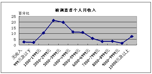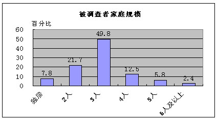 从家庭规模上看,本次调查中三口之家所占比例最大,将近50%,其次是2人的家庭,约占21.7%。其他规模的家庭所占比例均比较小。 5、收入情况