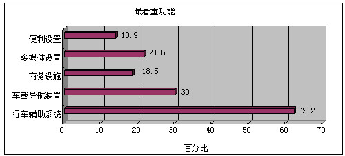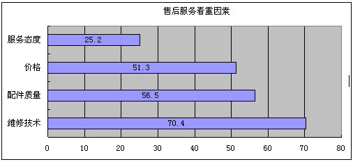 有62.2%的消费者看重汽车配置中的行车辅助系统,30%的消费者看重车载导航装置,21.6%的消费者看重多媒体配置。这三个功能分列最看重功能的前三名。可以看出,人们更注重汽车作为交通工具而配置的功能,其他附件的重要程度还在其次。 (3)售后服务