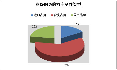 62%的被访者选择购买合资品牌的汽车,其次为国产品牌,占了22%,而选择购买进口品牌的只有16%,相较上次调查数据,有明显下降。可见,在现阶段,合资品牌的汽车在市场上依旧占有绝对优势。