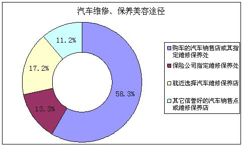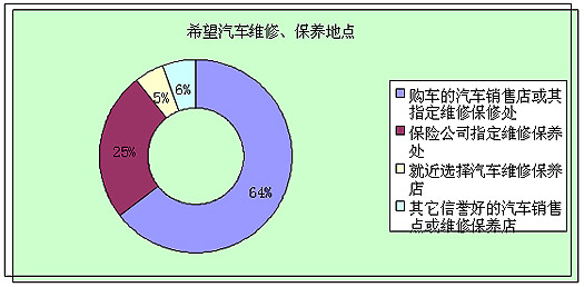 大多数人希望在购车销售店或其指定维修保修处对汽车进行维修保养,占被调查者总数的64%。但有25%的人群倾向于在保险公司指定的维修保养处维修和保养汽车。与上次调查结果不同的是,本次调查样本中,选择就近维修保养的人数只占5%,与上次的20%差距较大。总之,可以明显看出,购车人群更倾向于在买车处维修和保养汽车。 |
