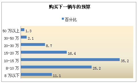 买车预算为10—15万的人所占比例最高,达到35.2%。紧随其后,25.2%的人选择购买8—10万的车,16.4%的人选择购买15—20万的车。人们的买车预算主要集中在这三个价格区间。可以看出,受经济危机的冲击,购买高端车的比例在下降,更多的人还是倾向购买价格适中的中端汽车。