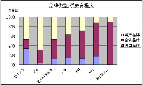 随着受教育程度的提高,选择国产品牌的比例逐渐减少,而选择合资品牌的比例逐渐增多,这表明具有较高品质且价格不是太高的合资品牌是高学历人群的最佳选择。