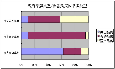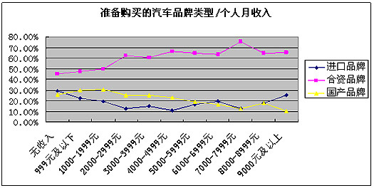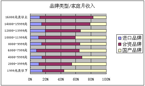 个人月收入在3000元——3999元的比例较高,选择购买合资品牌和国产品牌的人,则主要集中在个人月收入在2000元——2999元的人群中。可以看出,随个人月收入的增高,选择购买国产品牌的比例降低,同时,选择购买进口品牌的比例有所上升,尤其是9000元及以上收入的人群,相对更倾向于购买进口品牌。不管个人月收入的多少,对合资品牌的选择始终是占大多数的。