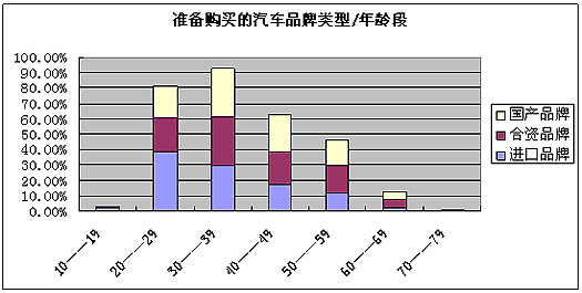 我们可以看出,购买进口品牌的人中,年龄在20岁—29岁的最多,主要是年轻人,随年龄增长,对进口品牌的认可度有所下降。而购买国产品牌和合资品牌的,则以30岁—39岁的人居多。