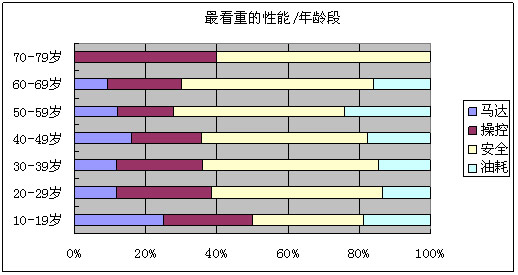 随着年龄的增加,人们对马达动力的关注越来越低,而对于安全性能的关注则越来越高。在所有消费者群体中,汽车的安全性能所占的比例均最高。 (2)汽车配置