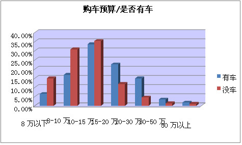 有车一族整体的购车预算要高于无车一族。具体看是否有车和买车预算之间的关系,可以发现,在准备购买15万以上的汽车的人群中,有车一族比例明显高于没车一族,而在准备购买15万以下的汽车的人群中,没车一族的比例则相对较高。这反映了人们需求层次的变化。当已有车可以满足自己基本需求的时候,人们会希望购买更高档的车,预算也会提高。而在还没有满足基本用车需求的情况下,人们则更倾向购买价格适中的车。 品牌选择