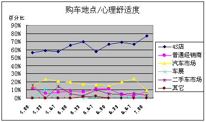 购车地点与心理舒适度呈现显著的相关性。由图可知,在对心理舒适度(纵横轴表示消费者对于心理舒适度的重视程度,7为很重要,1为很不重要,数值越大,表明消费者越重视这个因素)要求大于平均分的受访者中,选择4S店的消费者的百分比都大大高于其他地点,表明选择4S店作为购车地点的消费者对心理舒适度的要求最高。另外选择去汽车市场的购车者比例也较高。选择去二手车市场购车的消费者比例随着心理舒适度的提高有下降的趋势,表明选择二手车市场作为购车地点的消费者没有选择其他购车地点的消费者重视心理舒适度。