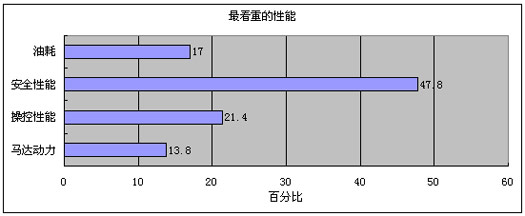 可以看出,在汽车的各项性能当中,将近一半的消费者都认为安全性能最重要。有13.8%的人认为马达动力最重要,21.4%的人认为操控性能最重要,其比例相似。而我们预期重要程度比较高的油耗,仅被17%的消费者选为最重要的因素。当然,这并不是说油耗在人们心中的地位就不重要,而是说,它不是第一考虑因素。