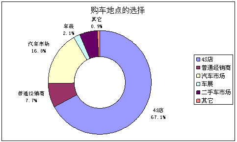 在现有车的被访者中,4S店仍是他们购车的首选,占总体的67.1%,之后分别是汽车市场16.8%,普通经销商7.7%,二手车市场5.4%,车展2.1%和其他0.9%。 与2008年上半年的调查相比,4S店不仅保持其遥遥领先的位置,并且稳中有升;汽车市场的地位继续上升,同时,人们更加关注二手车市场和车展。