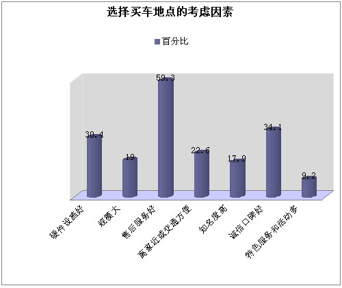 将近60%的被访者认为售后服务好是其选择买车地点的重要考虑因素,这与上次调查结果完全一致。选择诚信口碑好和硬件设施好的比例紧随其后,分别为34.1%和30.4%,特色服务和活动多的比例排在最后,为9.2%。可见,做好售后服务,抓好基础设施,树立良好口碑,是汽车销售点所应努力的方向,尤其是售后服务,更是重中之重。