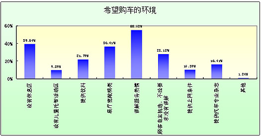 在购车环境方面,消费者特别希望购车场所能提供热情的讲解服务,设有休息区,同时展厅要宽敞明亮。本次调查中,55.08%的被调查者明确希望讲解服务热情,高居各购车环境要求之首。但是也有28.18%的被调查者表示应由顾客自主选择讲解服务,不经要求没有讲解。总体来看,消费者对于购车环境的要求不是很高。但是在产品差异化难度日益加大的今天,服务差异化和人性化也很受青睐。39.54%的被调查者希望设有休息区,21.79%的被调查者希望提供饮料。
