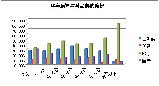 可以看出,购车预算越大,愿意购买欧系车的比例就越高。购车预算在50万以上的人,主要选择购买欧系车。 油耗期望