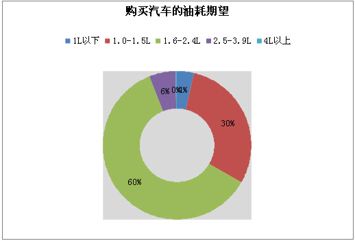 由图可以看出,大多数人的油耗期望在1.6—2.4升,占60%,其次是1.0—1.5升,占了30%。油耗期望在2.5以上和1升以下的比例则极低。