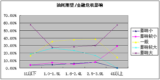 油耗期望在1升以下和4升以上的人更倾向认为金融危机影响大,而油耗期望在1升—3.9升的人,往往会认为金融危机影响一般。由此可以看出,金融危机确实在宏观上影响了人们对于汽车消费的看法,对使用成本的关注度提高也不足为怪。