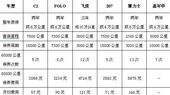 虽然几乎所有厂家的首保都是免费赠送,但由于首保里程不同,保养周期也不同,在60000公里前需要做的常规保养和二级保养次数也不同,费用自然也不同。 ●东风雪铁龙C2
