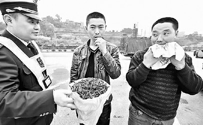 本报讯 重庆消息:10日,渝武高速公路团山堡服务区疲劳驾驶休息点。川籍货车司机陈军洗完脸后,目光停留在桌上供疲劳司机自选的提神用品上。“这东西提神肯定来劲!”他伸手抓起一个干辣椒,丢进嘴里嚼起来…… 从上周一开始,重庆市高速公路执法支队在服务区建起疲劳驾驶休息点。司机进入休息点后,除可以睡觉休息外,还可以选择嚼干辣椒、擦风油精等方式提神解乏(见图)。 执法队员说,为何想到用辣椒提神?据称,开车上渝武高速公路的疲劳司机中,四川、云南和湖南人居多,而俗话说四川人不怕辣、云南人辣不怕、湖南人怕不辣。 据介绍,辣椒摆出9天来,千余司机已吃掉1.5公斤。 嚼完辣椒并不意味着司机就可以前行。“我们会劝导他们睡一会儿。”执法队员说,上周一起,已有38个疲劳司机在休息点床上睡过觉,有一位司机足足睡了约两小时。