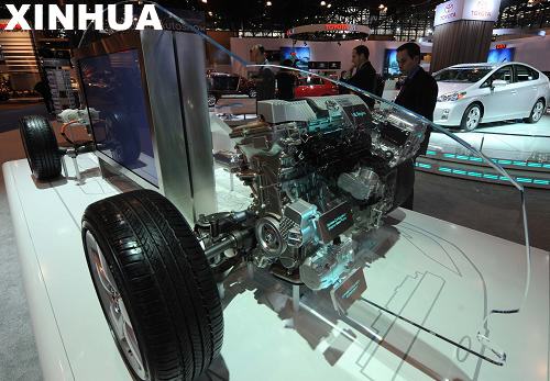 4月8日,在美国纽约举行的纽约国际车展媒体开放日上,观众在观看丰田普锐斯(Prius)混合动力车的动力系统。