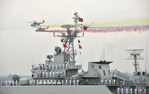 ![]() 新华网4月23日报道(记者白瑞雪、李宣良、吴登峰)中国23日下午在青岛附近黄海海域举行海上阅兵,庆祝中国人民解放军海军诞生60周年。 这是人民海军历史上最大规模的海上阅兵,也是中国第一次举办多国海军检阅活动。 胡锦涛主席乘坐“石家庄”号导弹驱逐舰,检阅中外舰艇。 阅兵分为海上分列式和海上检阅两部分,历时近1个小时。 在分列式中,潜艇群、驱逐舰群、护卫舰群和导弹艇群组成的舰艇编队以单纵队通过阅兵舰,电子侦察机、警戒机、歼击机和直升机组成的空中编队按批次跟进飞行,一一接受检阅。 中方受阅部队共计25艘舰艇、31架飞机。它们全部是中国自主研制的装备,其中核动力潜艇、“兰州”号导弹驱逐舰等是中国海军的最新型装备。 《2008年中国的国防》白皮书说,经过60年的建设,海军已初步发展成为一支多兵种合成、具有核常双重作战手段的现代海上作战力量,初步形成以第二代装备为主体、第三代装备为骨干的武器装备体系。 来自俄罗斯、美国、法国、印度、韩国等14个国家的21艘军舰按照作战舰艇、登陆舰艇、辅助船、训练舰的先后顺序和吨位大小锚泊在预定海域,接受了检阅。 这些舰艇是从18日晚起陆续抵达中国青岛的。它们当中,近一半军舰曾访问过中国,有的还曾与中国海军进行过联合军事演习。 ![]()