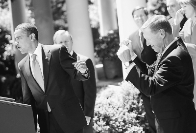 美国总统奥巴马在首都华盛顿白宫玫瑰园发表讲话,福特汽车公司首席执行官阿兰·穆拉利(前右)在一旁举手欢呼。 |