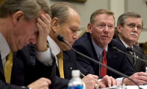 2008年11月19日,华盛顿,左起:GM的CEO Rick Wagoner,克莱斯勒汽车公司CEO Robert Nardelli,福特CEO Alan Mulally,全美汽车工人联合会主席Ron Gettelfinger出席国会作证。由于经营管理失误以及债务等问题,美国通用汽车公司1日正式递交破产保护申请。通用汽车公司也因此成为美国历史上申请破产的最大的工业企业。 (东方IC 版权作品 资料图片)