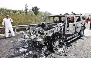 记者事后网上搜索,未发现有悍马自燃的。不过,新华网曾在去年9月18日发布信息称,因风窗清洗液加热电路可能短路,极端状态下可能引起火焰,通用汽车(中国)投资有限公司已向国家质检总局递交报告,拟从当月19日起召回部分进口的悍马H2等车,涉及车辆生产日期为2006年至2008年。
