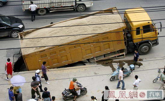 武昌白沙洲大道武泰闸路段,司机戴师傅驾驶一辆满载黄沙的翻斗车经过事发路段,路面突然塌陷,车中后部陷至地下。直到下午5时许,在转运完一车黄沙后,翻斗车才被吊车吊出大坑。