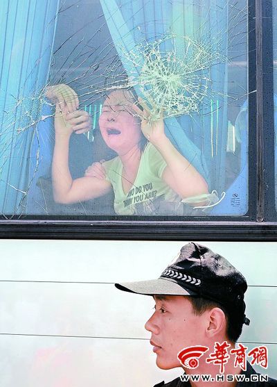 ![]() 昨日,情绪激动的死者家属砸裂大巴车窗,不准乘客下车。为防止发生意外,特警围在大巴四周保护